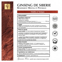 INGRÉDIENT MÉDICINAL : Chaque capsule contient : GINSENG SIBÉRIEN (extrait 4 :1)..........500 mg (Eleutherococcus senticosus) (racine) équivalent à 2 000 mg de racines séchées