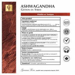 INGRÉDIENT MÉDICINAL : Chaque capsule contient : ASHWAGANDHA (Withania somnifera) (extrait 20 :1).....300 mg (racine, feuille) équivalent à 6 000 mg de plante entière séchée