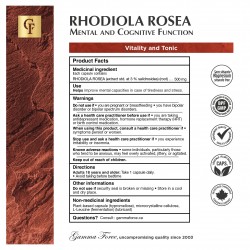 INGRÉDIENT MÉDICINAL : Chaque capsule contient : RHODIOLE (extrait std. à 3% salidrosides) ....500 mg (Rhodiola rosea) (racine)
