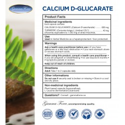 INGRÉDIENTS MÉDICINAUX : Chaque capsule contient : CALCIUM D-GLUCARATE ( D-saccharate de calcium)…...........600 mg CURCUMA (Curcuma longa L.) (extrait 25 :1)...............................40 mg (rhizome) équivalent à 1 000 mg de rhizomes séchés