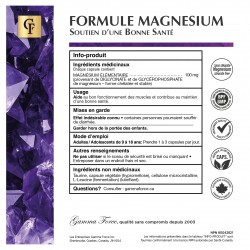 Chaque capsule contient : MAGNÉSIUM ÉLÉMENTAIRE … ........100 mg (Issu de DIGLYCINATE de magnésium hautement chélaté en glycine et de GLYCÉROPHOSPHATE de magnésium liposoluble)